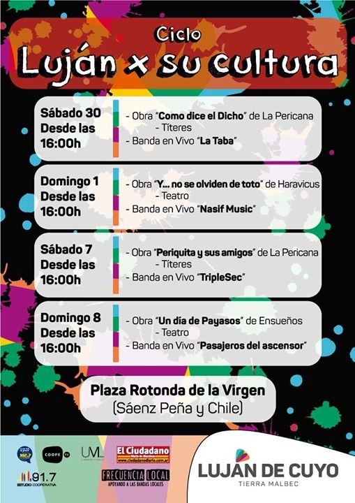 La Dirección de Cultura de la Municipalidad de Luján lanzó el ciclo «Luján por su cultura», el cual se realiza en la plaza de la Rotonda de la Virgen (Sáenz Peña y Chile), a partir de las 16 hs. El proyecto está enmarcado en la agenda de mayo, con motivo de conmemorar el 161º aniversario del Departamento.