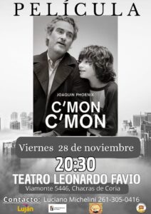 Información de la Película. Una delicada y profunda historia sobre el pasado, el futuro y el inesperado lazo que une a un tío y su sobrino en un viaje a través de Estados Unidos.La película «C’mon C’mon» (2021) está dirigida por Mike Mills.Sinopsis:Johnny (Joaquin Phoenix) es un periodista de radio que viaja por Estados Unidos entrevistando a niños y adolescentes sobre su futuro. Su vida da un giro cuando su hermana, Viv, le pide que se haga cargo de su precoz y joven sobrino, Jesse (Woody Norman), por un tiempo. Juntos, Johnny y Jesse inician un viaje por carretera a través del país donde forjan un vínculo inesperado y profundo, explorando temas de conexión, familia y la incertidumbre de la vida a través de diálogos sensibles filmados en blanco y negro. Protagonistas Principales:Joaquin Phoenix como Johnny Woody. Norman como Jesse. Gaby Hoffmann como Viv. Información del Evento (Fecha, Hora y Lugar) Detalle. Información. Fecha: Viernes 28 de noviembre. Hora: 20:30 hs. Lugar: Teatro Leonardo Favio (frente a la plaza de Chacras) Entrada: $5000 por persona (disponible en taquilla)