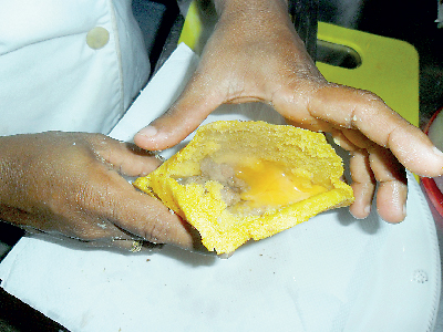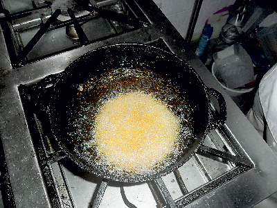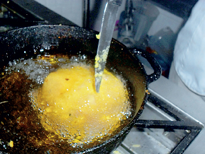 7 – Bajar la temperatura del aceite y llevar nuevamente la arepa al fuego por un minuto más hasta que el huevo se cocine. Realizar pequeños pinchazos en la masa para apurar su cocción. La arepa tomará un color dorado. Nuevamente escurrir y servir con ají picante y cilantro, o suero costeño.