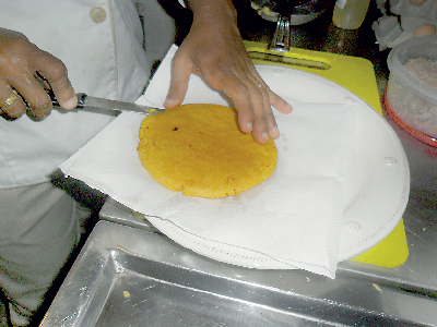 1 – En un tazón mezclar la harina de maíz y la sal. Agregar el agua de a poco, hasta obtener una masa suave y manejable. Amasarla bien para evitar grumos.