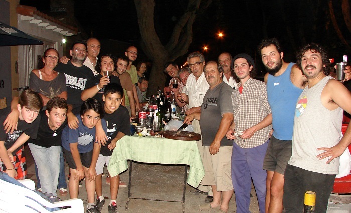 Un turista que pasaba por allí fue invitado a participar de la reunión vecinal y se quedó con gusto. A su lado, el vecino Chacho y frente a ellos, Cacho Chantire junto a su señora.