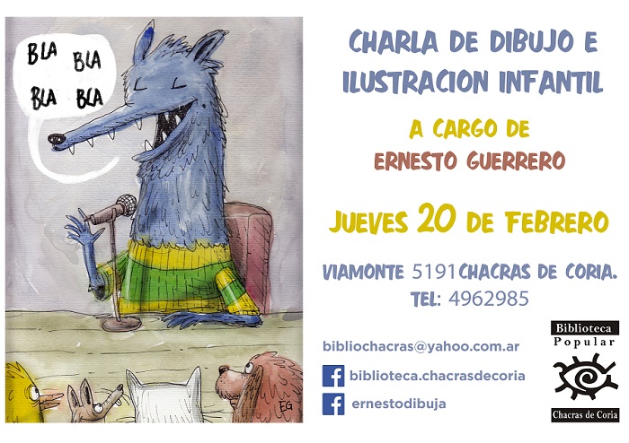 Imperdible la cita de este jueves 20 de febrero, a las 18 hs., en la Biblioteca Popular Chacras de Coria, donde el ilustrador Ernesto Guerrero dará una charla y un mini taller para los más pequeños en una actividad libre y gratuita. El encuentro es en Viamonte 5191, Chacras. Informes al 4962985.