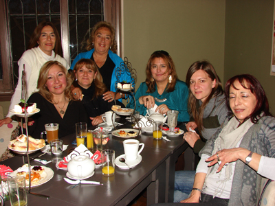 Gloria Ferrari, la abanderada del kiosco de Correveidile, festejó su cumple con un rico te de amigas en Filippa. Perla Virginio, Chachi Armani, Betty, la cumpeañera, Daisy Frings, Gaby Zeverini y Ema, saborean las exquisiteces que preparó Alejandra, la anfitriona, para un buen festejo.