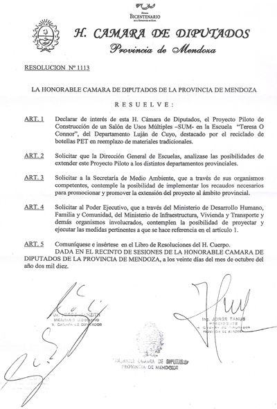 Por otra parte, un par de meses atrás, el proyecto ecológico que la comunidad educativa de la Teresa O’Connor está llevando adelante -construir un salón para diversas actividades con botellas de plástico, pallets y gomas de vehículos para el techo-, fue declarado de Interés Departamental a instancias del concejal Pablo Giaquinta y recientemente de interés legislativo, por el diputado