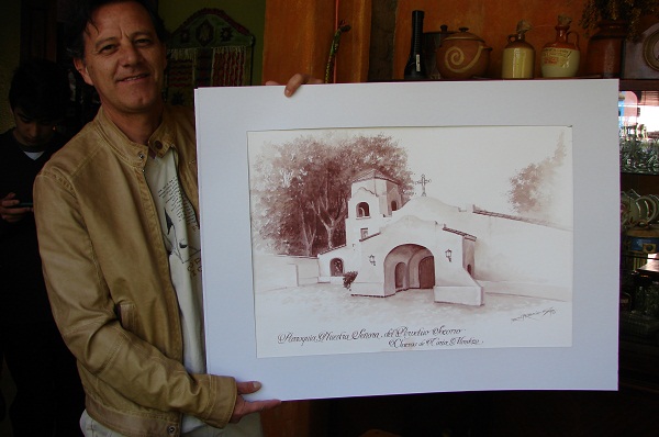 El artista plástico Martín Rodríguez muestra feliz su obra: una imagen de la Parroquia de Chacras realizada con vinos malbec y chardonnay, que donó para la subasta organizada para recaudar fondos pro arreglo de la estructura edilicia del templo. Tanto gustó que parece quedará en la misma Parroquia.