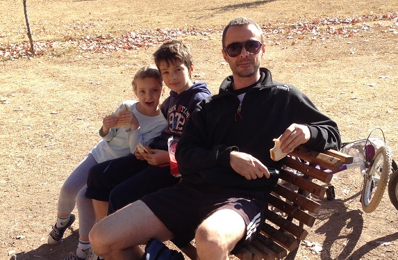 Aire libre. El veterinario Martín, de la veterinaria de calle Mitre, de paseo familiar con hijos y bicicletas, por el parque Gral. San Martín.