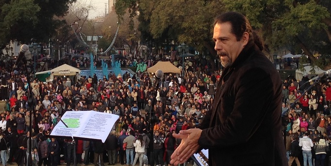 Oíd, mortales. Nuestro vecino y prestigioso músico Javier Rodríguez se prepara para entonar el Himno Nacional, versión cuyana, además de varias de sus bellas canciones.