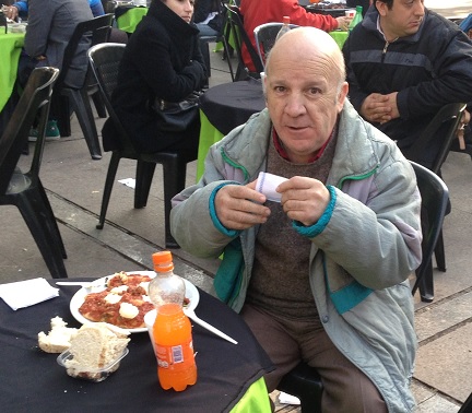 El Pipo. Recordado animador de las antiguas Retretas de la Plaza de Chacras, da cuenta de una frondosa porción de canelones.