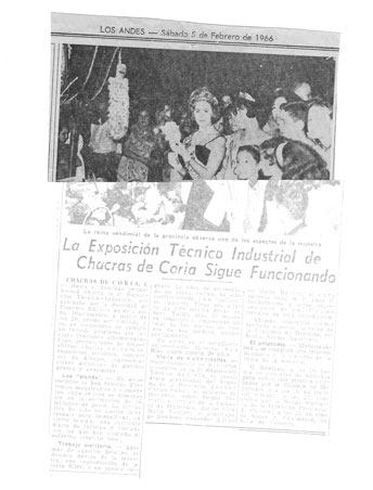 “Visita de autoridades. Oportunamente se hicieron presentes en la 1ra.Exposición Técnico Agrícola, el presidente provisional del Senado de la provincia, doctor Carlos Cabul; el Ministro de Hacienda, señor Sergio Ferrari; el titular de la Cámara de Diputados, doctor Luis María Vautier; el Arzobispo de Mendoza, Monseñor Alfonso María Buteler, el cura párroco R.P. Juan Goldaracena y otros representantes de calificados círculos de esta jurisdicción. Además, concurrió como invitada especial la reina de la Vendimia de Mendoza, señorita Norma Nassivera”
