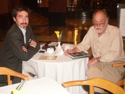 A las cuatro y diez minutos ha entrado al museo un hombre delgado de cabello canoso y barba discreta y blanca, esa que uno suele esperar de un psicoanalista. Trae un bolso y un bastón en el que se afirma. Camina encorvado, con esfuerzo – él también se ha sufrido una fuerte caída días atrás- y al llegar al café busca sobre sus anteojos, busca y no encuentra. Tiene la cara angulosa y una frente dilatada que avanza sobre la cabeza ganándole terreno al cabello. Me levanto de la mesa y salgo a su encuentro. Es el hijo de Discepolín, indiscutiblemente. Se me escapó un abrazo; a él, una sonrisa comprensiva de mi emoción. Sabe que al saludarlo, abrazo a su padre.