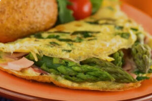 En la misma sartén que repasamos con papel de cocina para quitar el resto de agua que pueda haber quedado, agregamos una cucharada de AEVO. Una vez caliente le agregamos los huevos batidos y esperamos a que se haga la base, despegando con una espátula los bordes. En ese °disco° de huevo, elegimos una mitad y ahí agregamos los espárragos; sobre toda la superficie agregamos la ricota desmenuzada, el queso rallado y las especias que hayamos elegido. Tapar los espárragos con el medio disco que quedó sin ellos, dar vuelta la omelette, terminar de cocinar y servir con palta, verdeo, tomates, rúcula, jamón crudo, jamón cocido natural, etcétera, etcétera, etcétera…