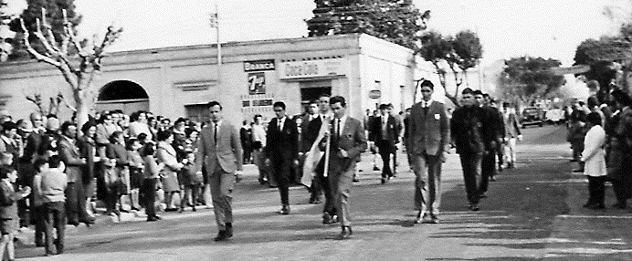 Corría la década del ’60 cuando los alumnos de la por entonces Escuela Nocturna de Electricidad, hoy Enrique Mosconi, desfilaban en fecha patria por la calle Viamonte, frente a la plaza.