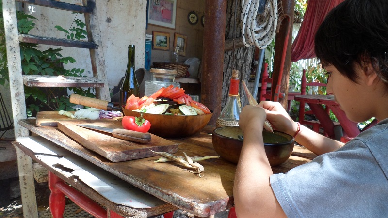 Sólo hay que pelar y cortar verduras, las que dicte su imaginación -tarea que implica un buen rato-, mientras otro hace y mantiene el fuego. Se calienta bien el disco, se le agrega el aceite DE OLIVA, se agregan algunos ajos para saborizar, se retiran y se agregan las verduras en orden de cocción. Casi cuando están listas se condimentan a gusto de cada uno, sal y pimienta básicos. Existen en el mercado unos masalas exquisitísimos, secretos muy bien guardados por sus usuarios para darle ese toque “magistral” a las comidas de lenta cocción.