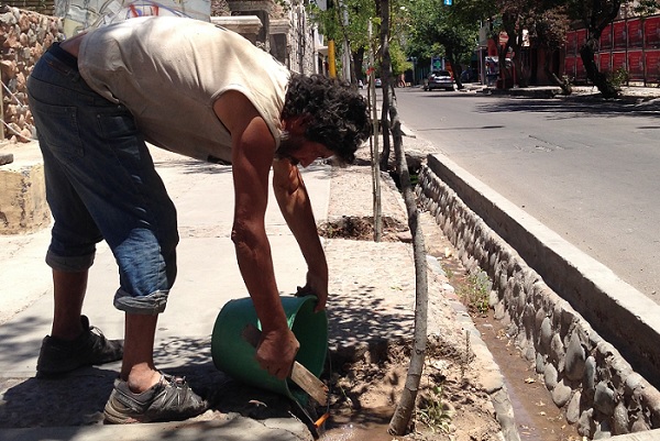 Pablo se encuentra abocado a la tarea de regar los jóvenes árboles recientemente plantados en calle Viamonte, a los que les faltaba bastante agua. Por suerte, ahora es él quien se ocupa de ellos y desde que se hizo cargo, no ha faltado ni un solo día a su responsabilidad. Los arbolitos, agradecidos.