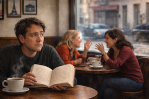 Me gustaría estar leyendo en un café de París o de Berlín o de Tokio, pero no porque el lugar le sume demasiado a esa burbuja en la que te mete un libro, sino porque no entiendo ni francés ni alemán ni japonés, entonces estas dos minas de la mesa de al lado, hablando bastante fuerte, no me obligarían a que me interese tanto por lo que le pasa a una tal Mariana, amiga de las dos.
