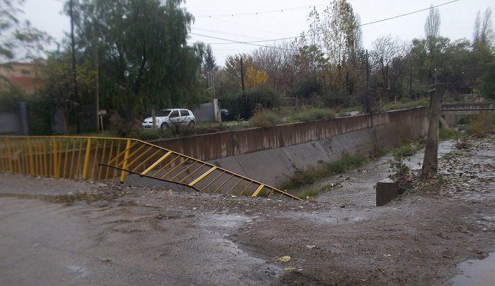Vecinos de calle Los Aromos reclaman por el riesgo que implica la baranda rota del primer puente hacia el Este -desde calle Viamonte- del Río Seco Sosa, que corre paralelo a calle Los Aromos.