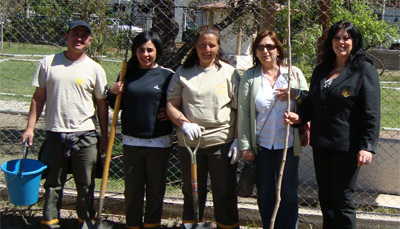 Juan Manuel Contreras, Gisela Rivero, Silvia Luna; Adriana Sayavedra, de la Unión Vecinal y Graciela Defeliche, delegada municipal. - Ante el anhelo de la Unión Vecinal de reforestar nuestro distrito como acción compensatoria por todos los ejemplares erradicados, y cumpliendo con el propósito de dicha asociación de crear un paseo peatonal y ciclístico en los marginales de la obra de canalización del Río Seco -que ya casi está finalizando la Dirección de Hidráulica-, se le solicitó a la Dirección de Recursos Naturales los ejemplares para comenzar a forestar el futuro espacio verde. En este punto, cabe destacar que dicho paseo ya fue anunciado por el intendente Omar Parisi, en ocasión de la inauguración de la obra hidráulica en el tramo calle Italia-Panamericana, junto al gobernador Celso Jaque.