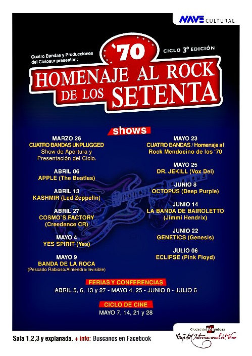 De marzo a julio: rock, cine y arte setentoso. El martes 26 de marzo y hasta el 6 de julio próximo vuelve por tercera vez la década de los setenta y toda su impronta a la Nave Cultural de Mendoza con el “Ciclo homenaje al rock de los setenta”, declarado de interés cultural por la Cámara de Diputados de Mendoza.