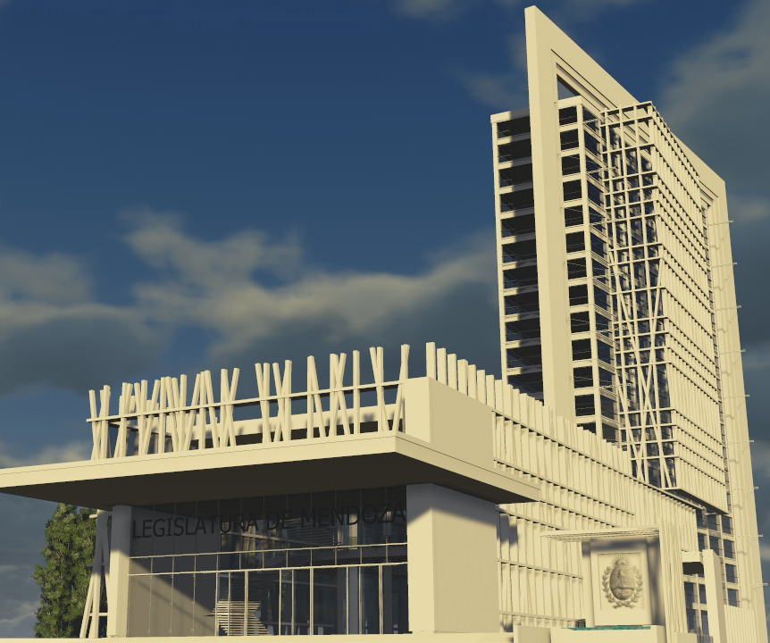 El proyecto tiene una inspiración fundamental: el edificio de la Facultad de Arquitectura de la Universidad de Mendoza, cuyo autor fue el arquitecto Enrico Tedeschi. Toda la estructura está a la vista con la diferencia de que hablamos de un edificio de gran altura, una planta libre con un núcleo de circulación vertical, lo cual hace más flexible el movimiento que necesitan las distintas oficinas legislativas. La intención ha sido disminuir sustancialmente la ocupación del suelo del parque y sacar partido de los cimientos creando alrededor de 500 espacios de estacionamiento ya que toda el área se encuentra hoy saturada de vehículos.