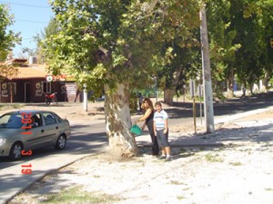 Claudia Ortega y su hijo Juan Francisco, vecinos del Barrio Carbometal, no quieren que esta planta se muera, por lo que ellos mismos acuden con un balde para regar al sediento y moribundo plátano.